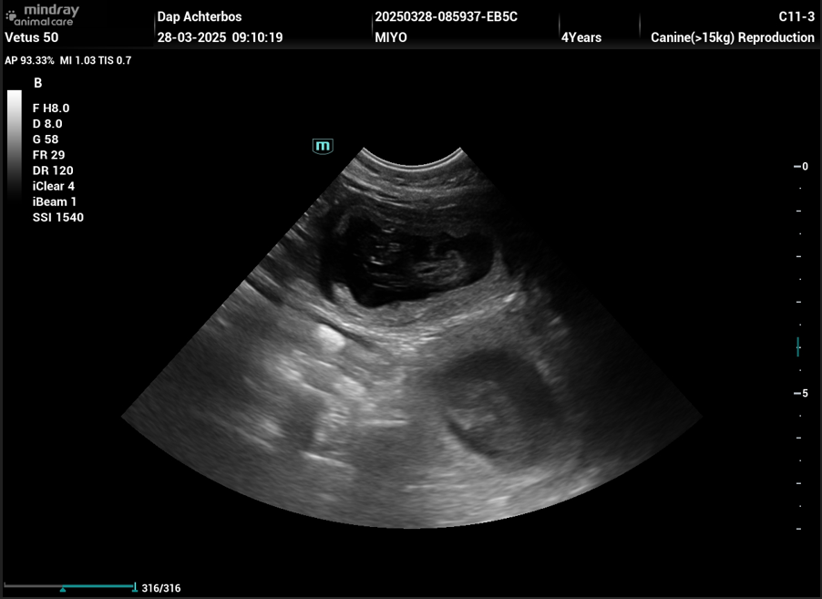 Uit ervaring weten we dat we enkel kunnen zien of ze drachtig is, maar niet van hoeveel pups exact, daar het hier enkel ‘vruchtjes’ betreft, die kunnen geteld worden. Zelfs voor een ervaren dierenarts is dit zeer moeilijk, daar de hond beweegt tijdens de echo.