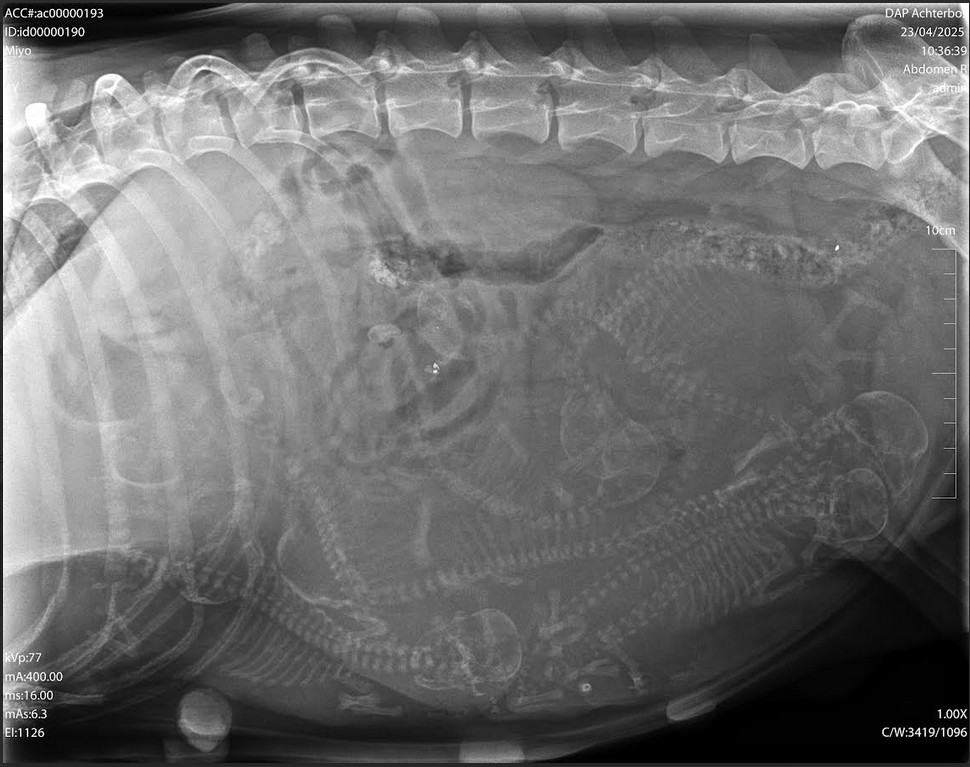 Op de röntgenfoto kan je de skelletjes van de pups tellen.
