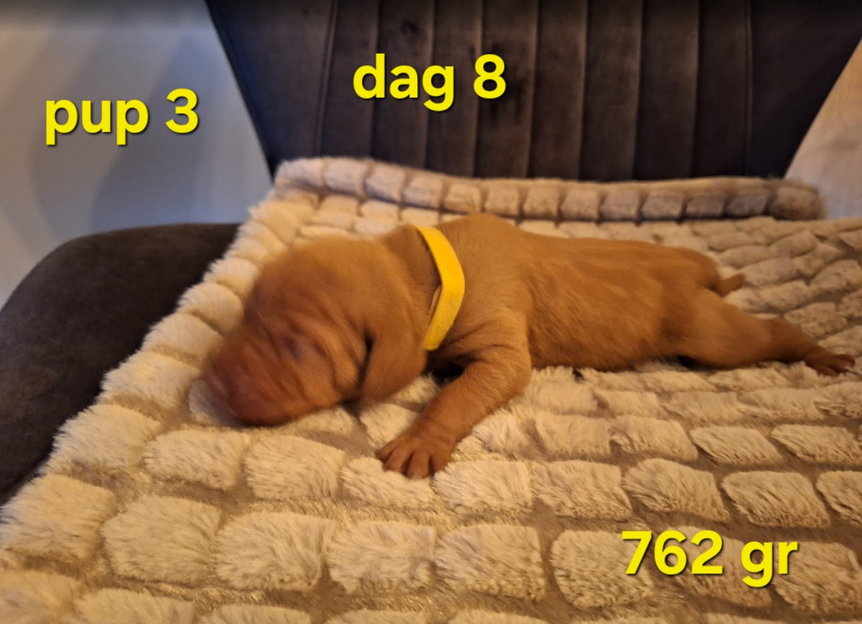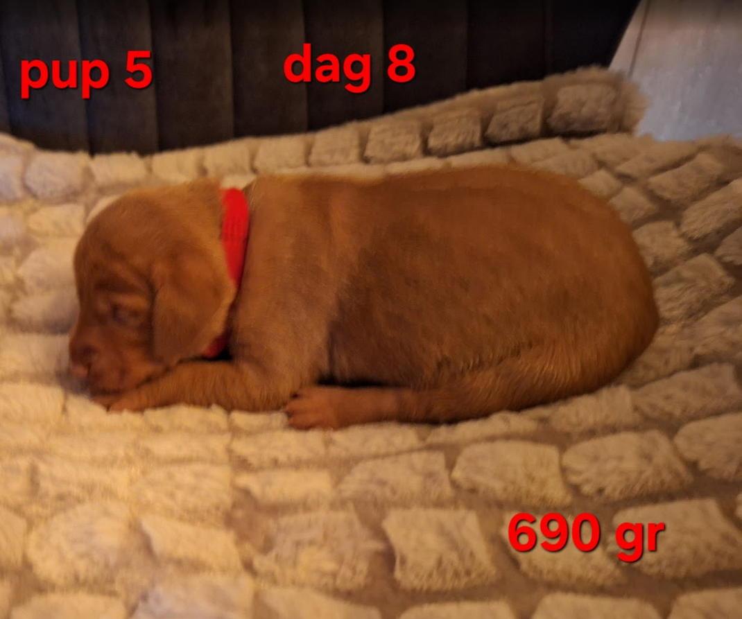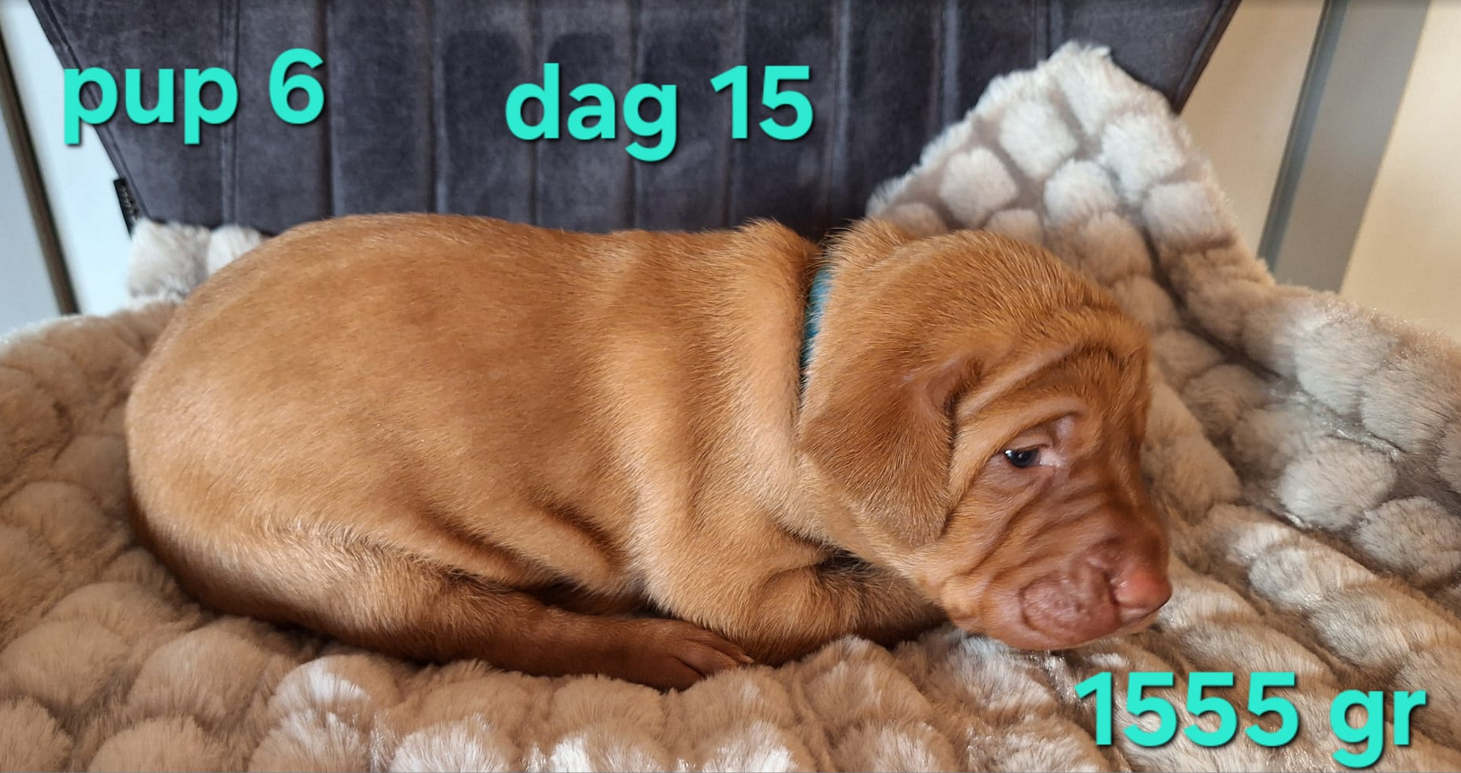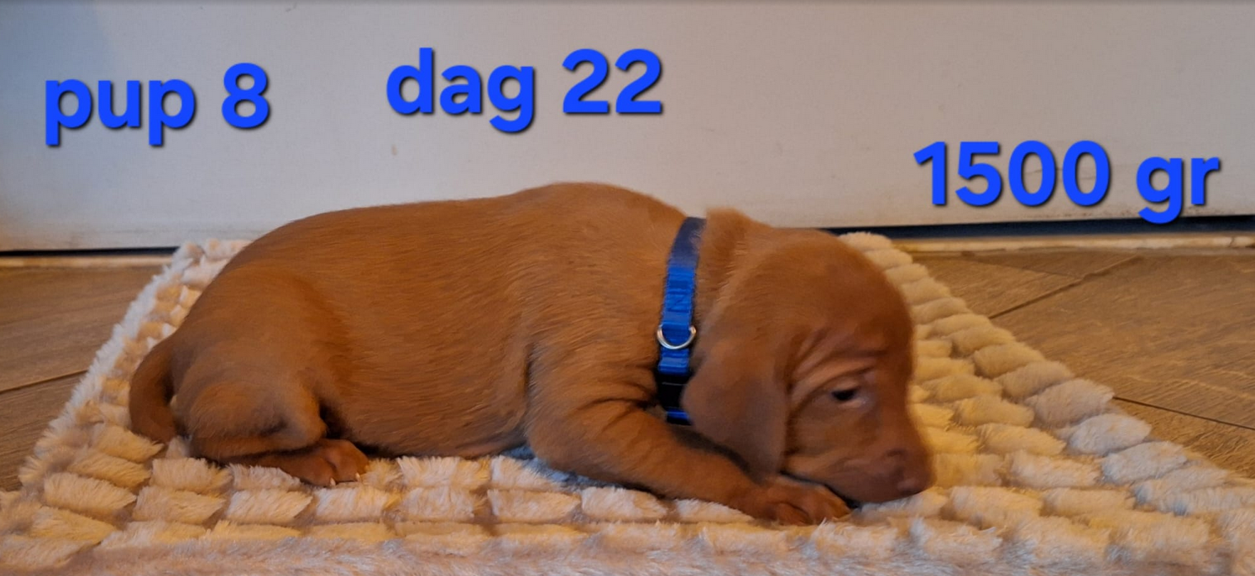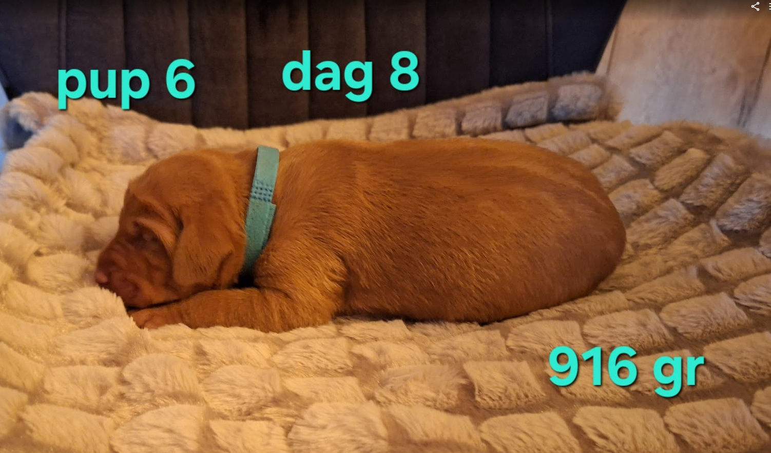 De pups zijn allemaal voorzien van een kleurenbandje en tevens is het geboortegewicht vermeld: