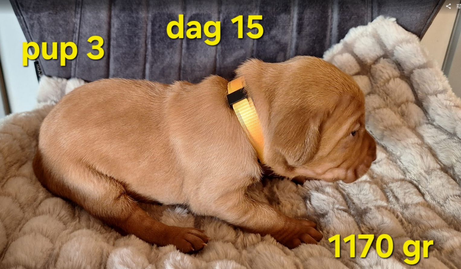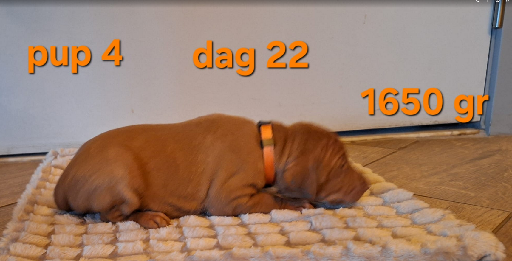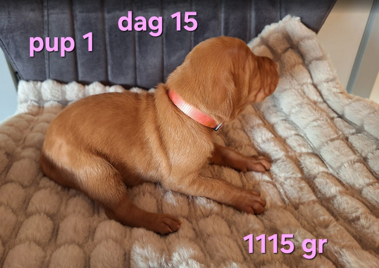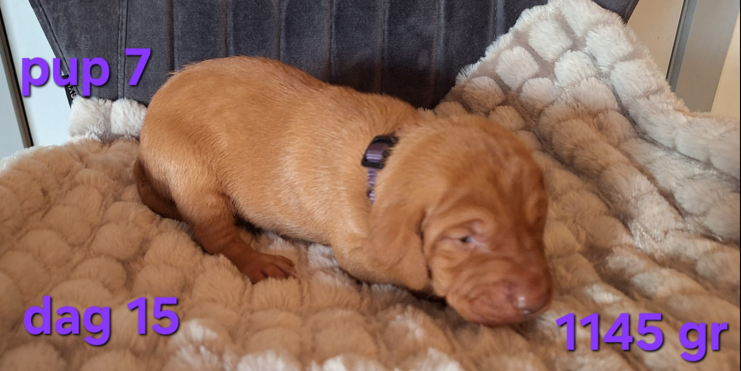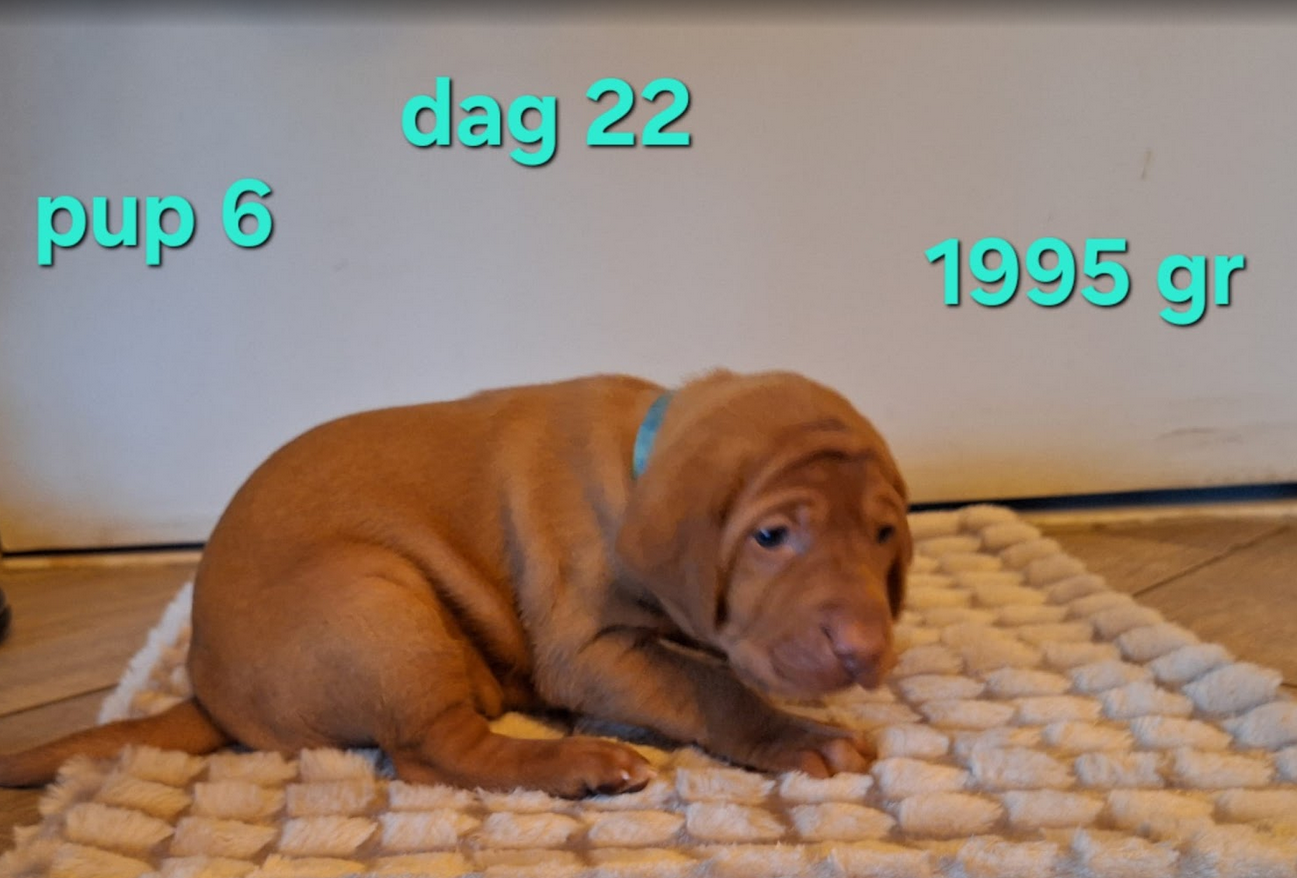 De pups zijn allemaal voorzien van een kleurenbandje en tevens is het geboortegewicht vermeld: