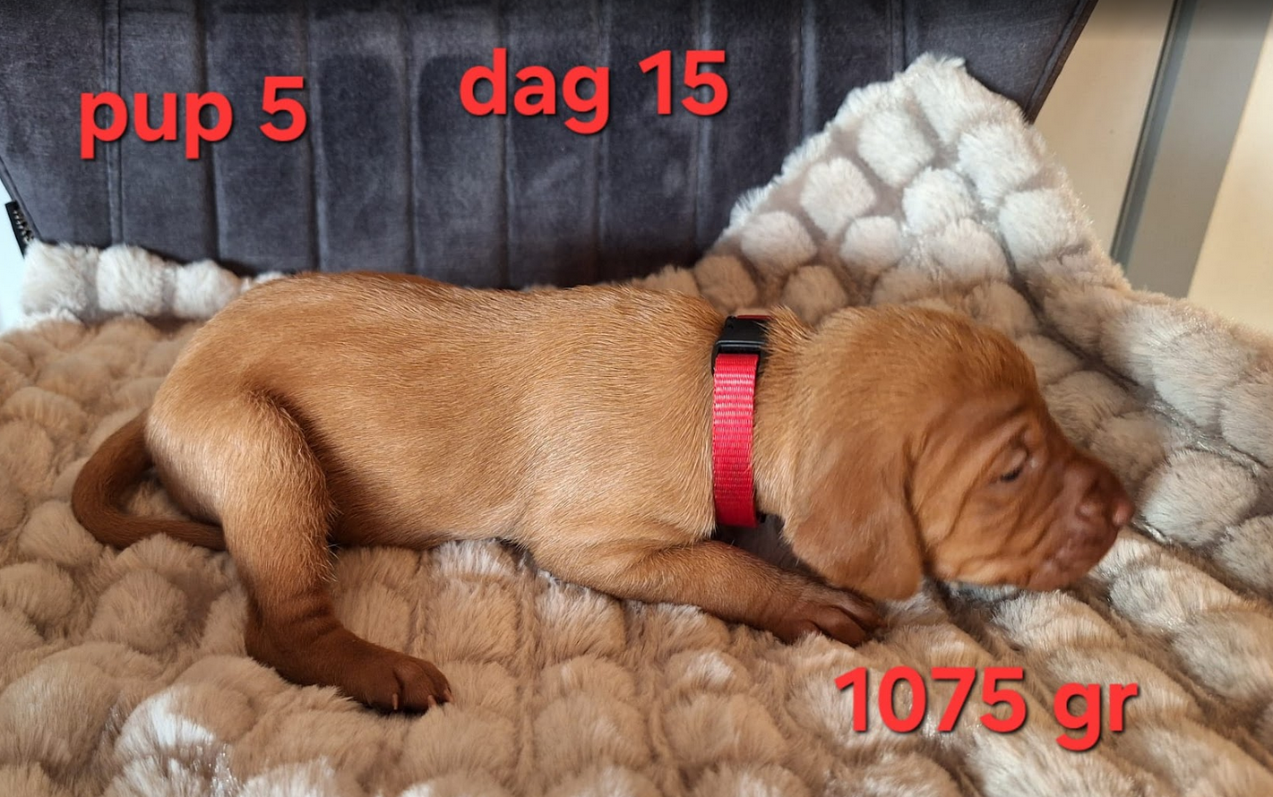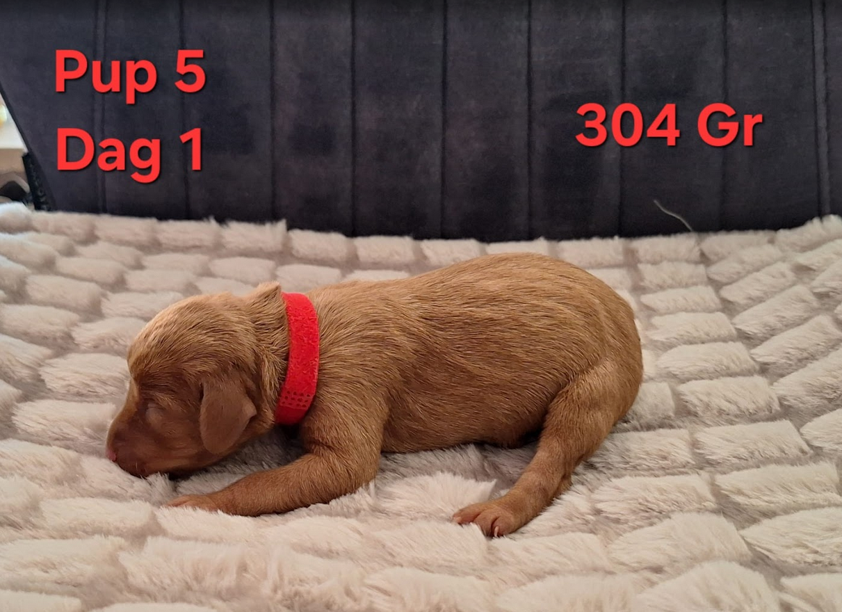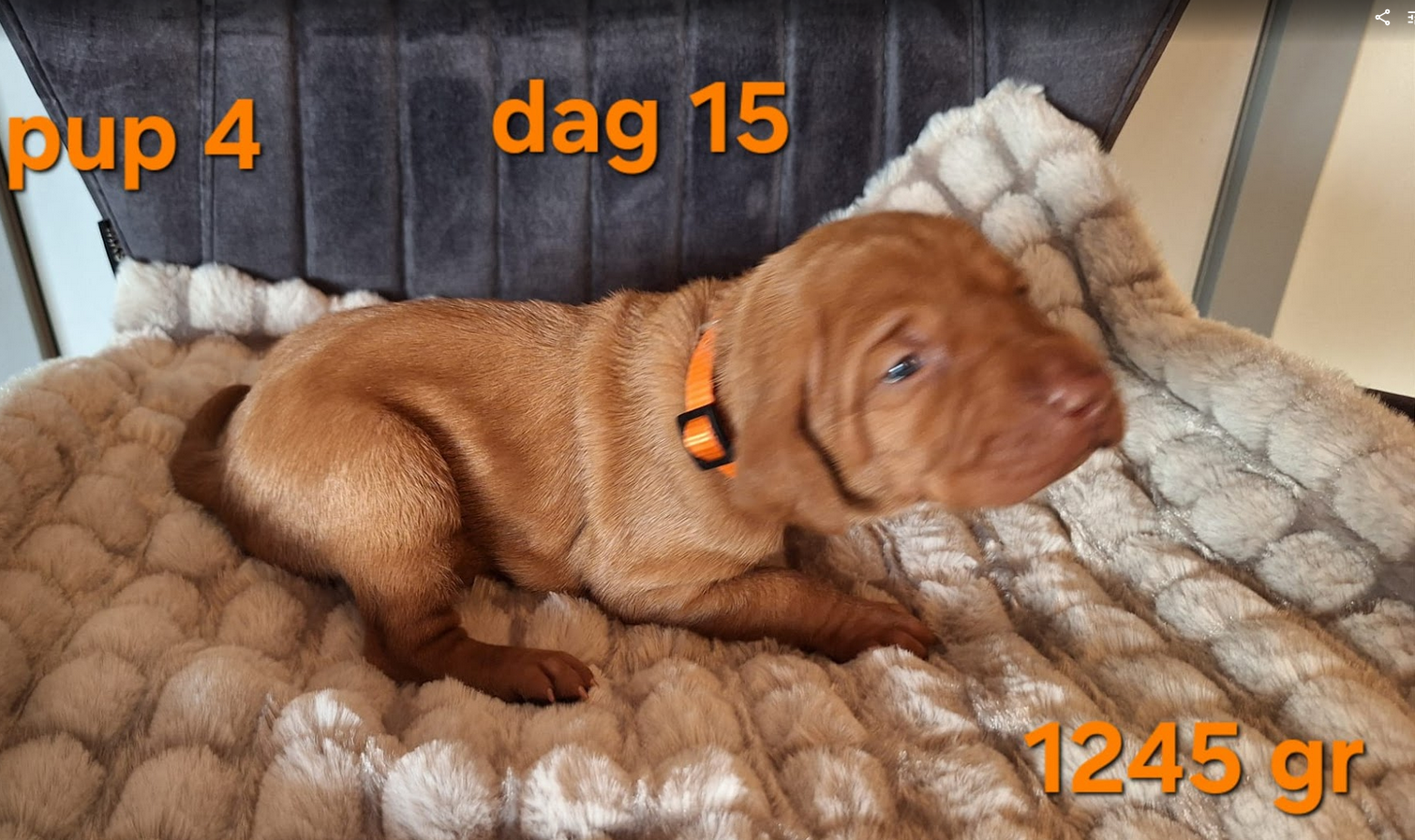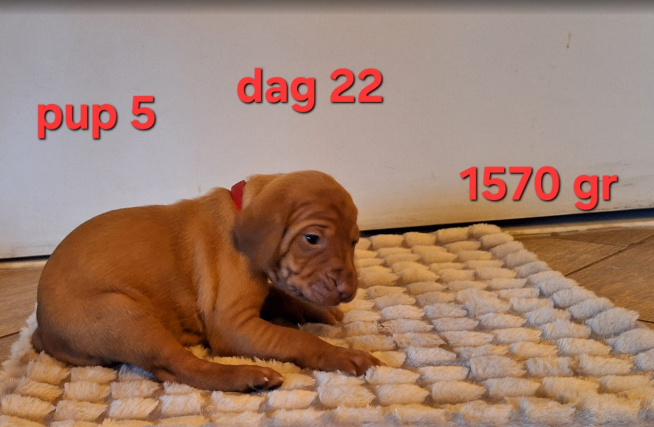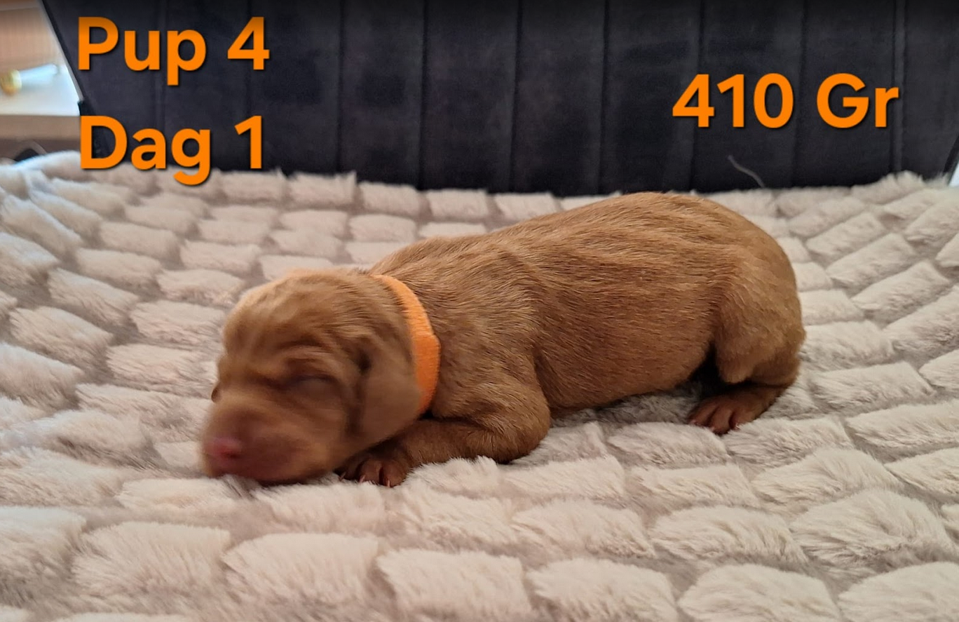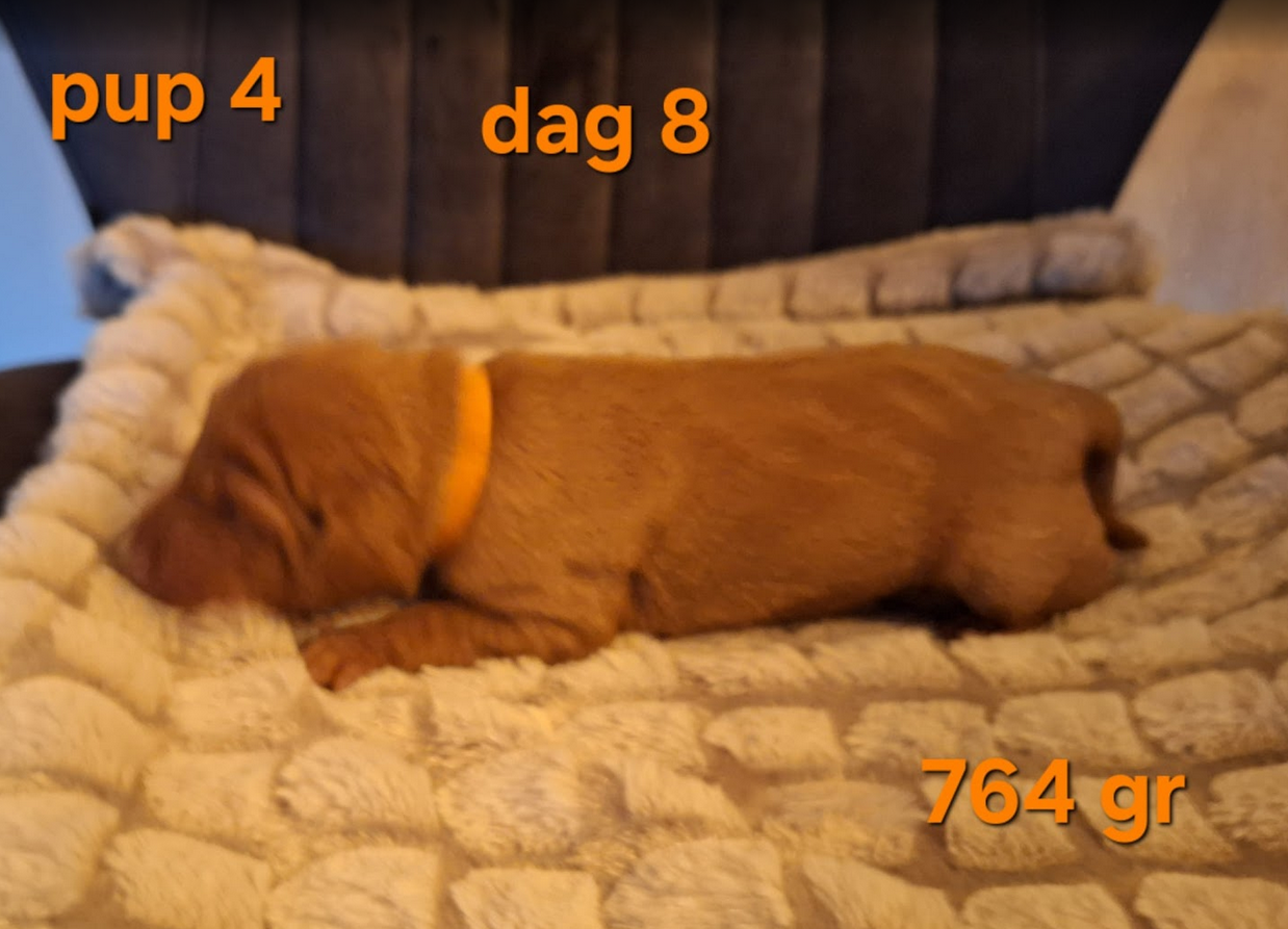 De pups zijn allemaal voorzien van een kleurenbandje en tevens is het geboortegewicht vermeld: