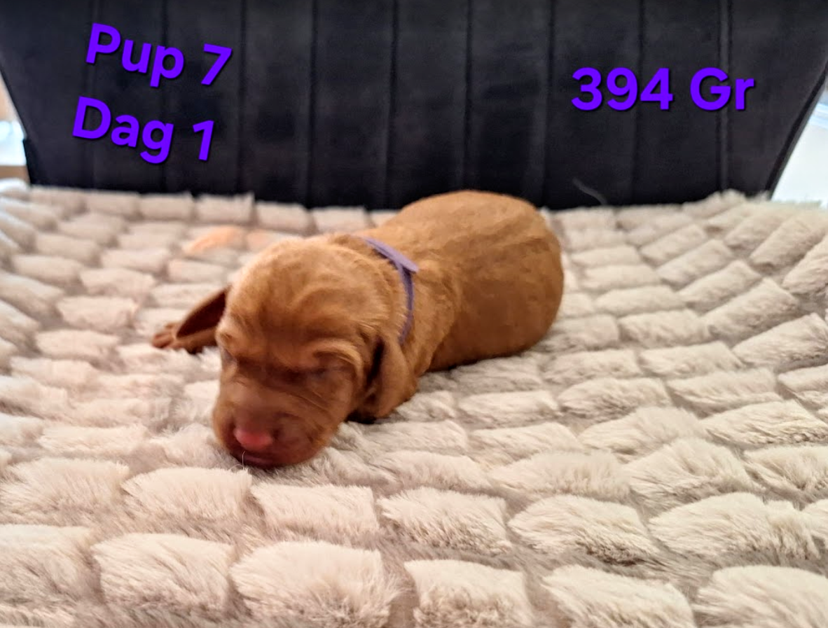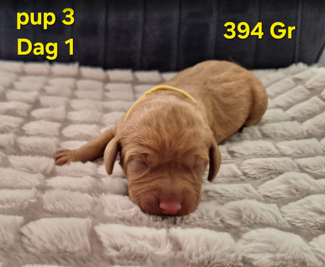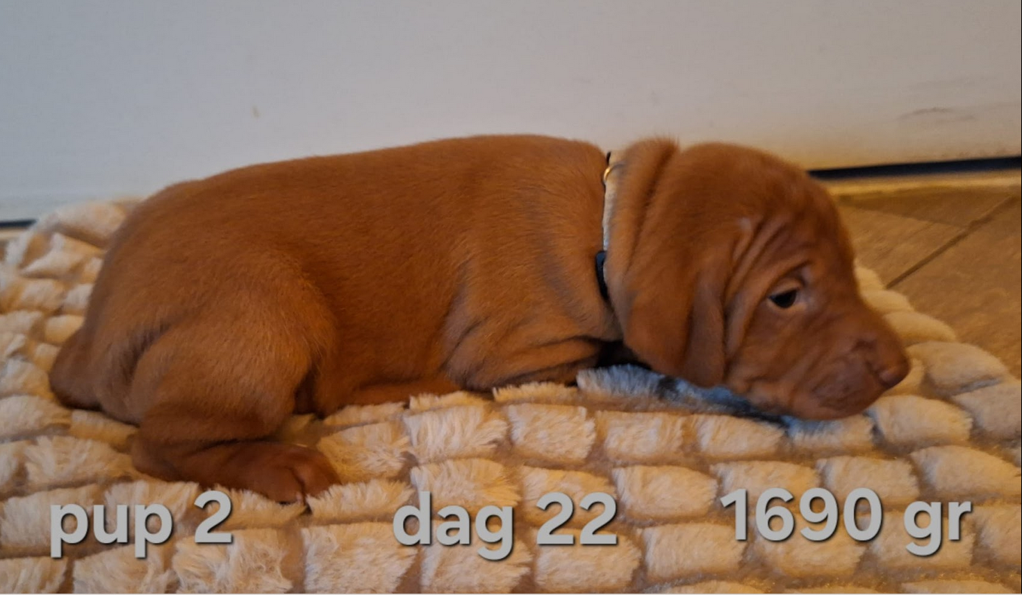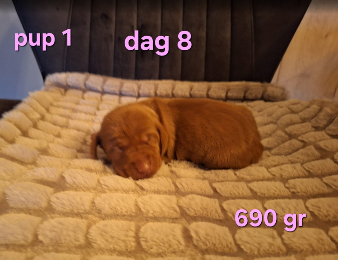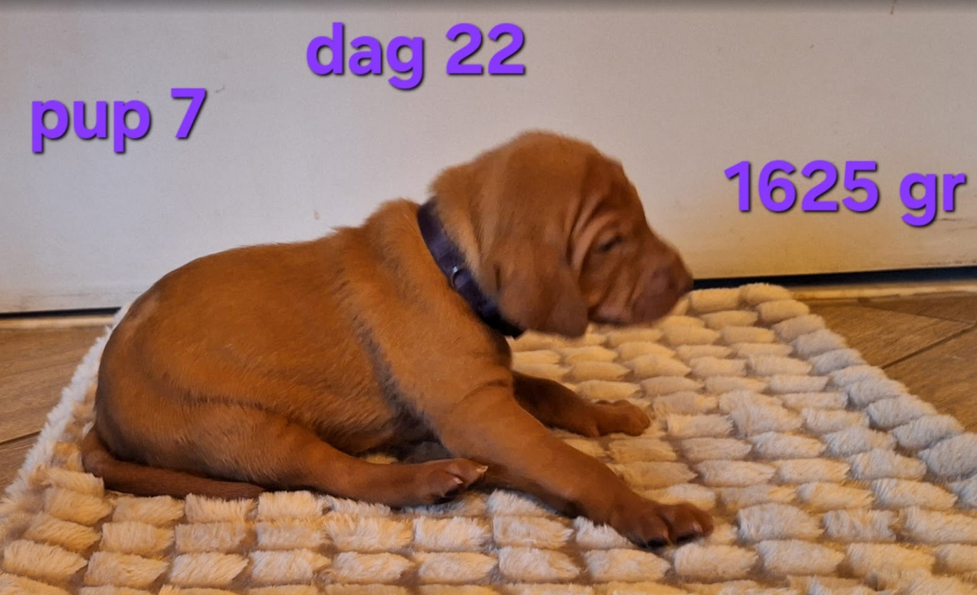 De pups zijn allemaal voorzien van een kleurenbandje en tevens is het geboortegewicht vermeld: